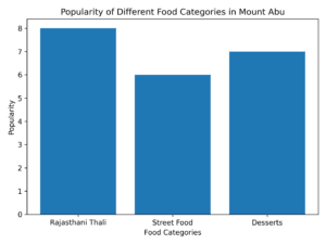 As depicted in our graph, the most popular food categories in Mount Abu include the Rajasthani Thali, a variety of street foods, and an array of delectable desserts.